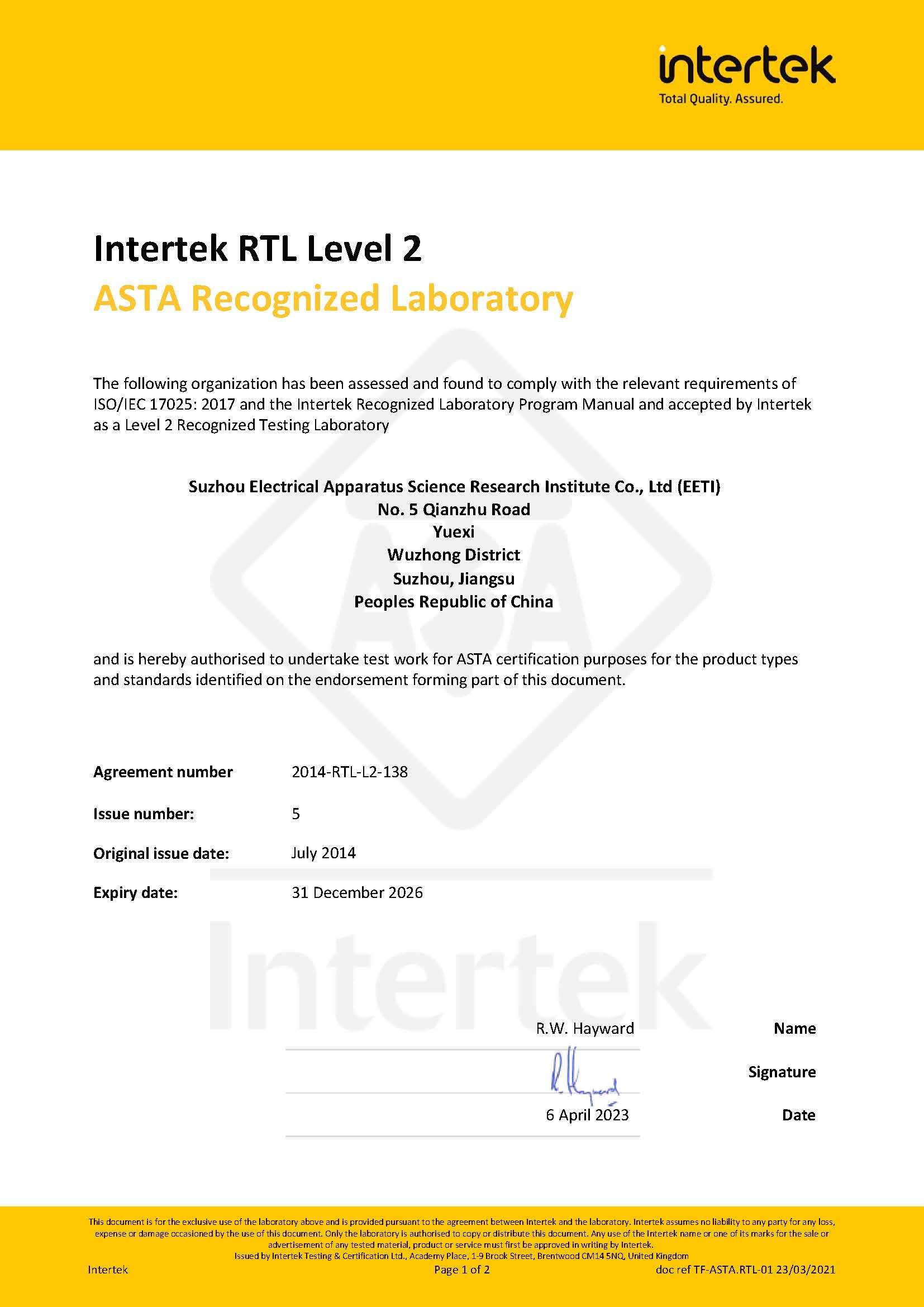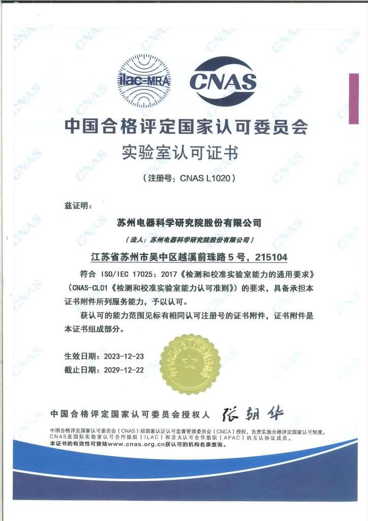 中国船级社产品检测和试验机构认可证书(电器产品)正面